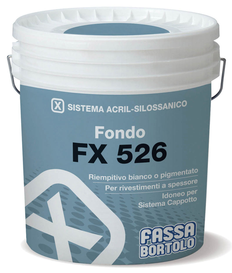 Aparte de ser usado como revestimiento tanto para exteriores como interiores, el fijador FX 526 se utiliza como fondo de anclaje de relleno, particularmente formulado para revestimientos en dispersión acuosa, como RAR 256, RTA 549, RSR 421, RX 561, Fassil R 336, ya sea sintéticos, minerales o siloxánicos. Gracias a su poder cubriente crea una superficie colorida y homogénea; al mismo tiempo la presencia de un árido fino mejora el anclaje del acabado a espesor ya sea en los S.A.T.E. que sobre soportes de muros ya pintados.